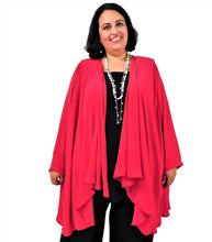 A red draped front duster is the perfect go-to-piece to layer all year long. Side concealed pockets, draped front in a light-weight crepe that adds breezy movement to any look.